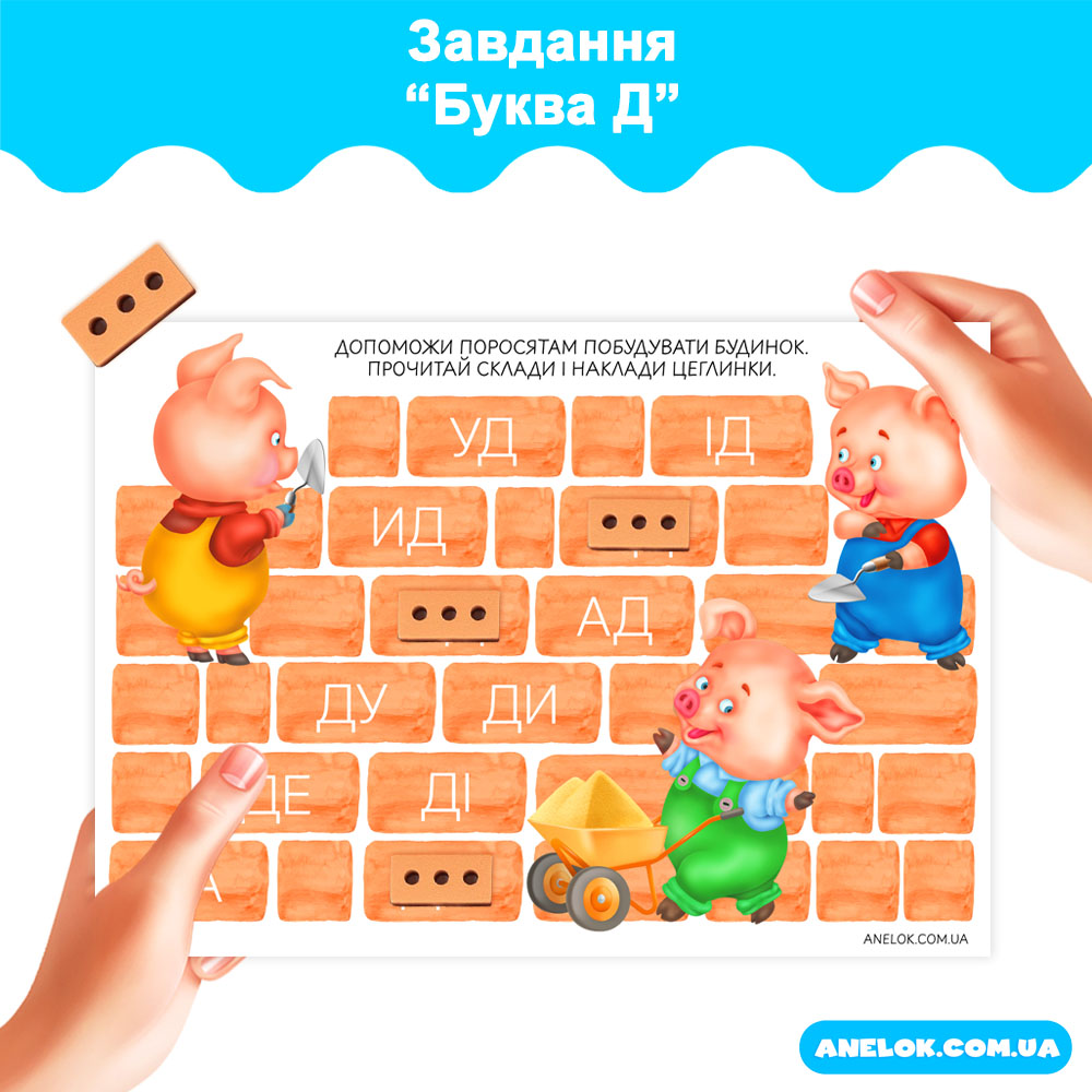 Буква Д — дидактичне завдання, що спрямоване на розвиток вмінь розчитування та читання складів під час підготовки до школи у дітей старшого дошкільного віку 5–6 років. Дидактичний матеріал з грамоти створений на основі сюжету казки “Три поросяти”. Робочі аркуші для дошкільнят на вивчення букви Д із серії ігор з предметами допоможе дітям тренуватися у читанні відкритих та закритих складів та накладати цеглинки, «будуючи» будиночок для героїв.