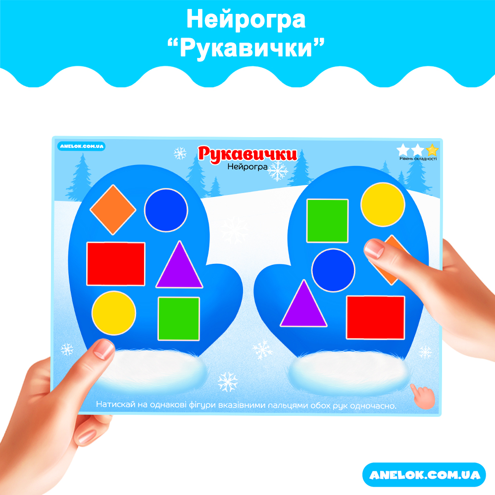 Бажаєте допомогти дитині покращити концентрацію уваги та активізувати роботу обох півкуль мозку? Нейрогра Рукавички — це ефективний та цікавий інструмент для гармонійного розвитку через одночасну роботу обох рук дитини. Представлена нейровправа побудована на принципі паралельного натискання на тотожні кольори. Виконуючи ігрове завдання, дитина закріплює знання про кольори та вчиться координувати рухи обох рук одночасно, що створює нові нейронні зв’язки. Такі нейровправи стануть чудовим доповненням у зимову пору року чи до Дня рукавички.